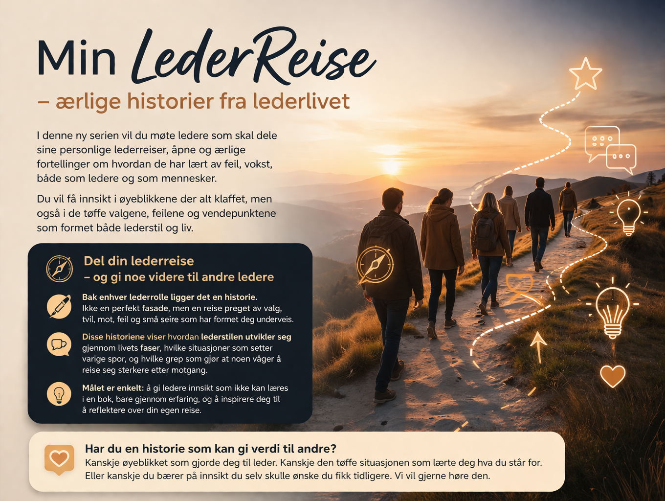 Har du en historie som kan gi verdi til andre? Kanskje øyeblikket som gjorde deg til leder. Kanskje den tøffe situasjonen som lærte deg hva du står for. Eller kanskje du bærer på innsikt du selv skulle ønske du fikk tidligere. Vi vil gjerne høre den.